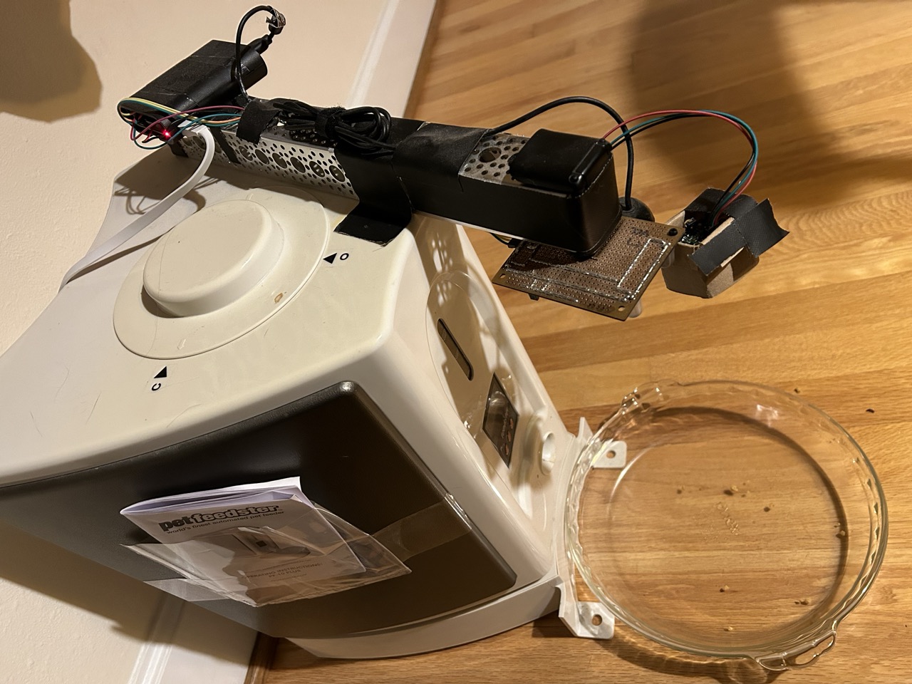 Above my cat's automatic pet feeder I placed a motion sensor connected to a Raspberry Pi. The Pi also has a USB camera. Every time the sensor trips, the Pi starts recording (and turns on some LEDs). Subsequent detections in a one-minute time window extend the recording window by another minute. A thumbnail image is extracted and both the MP4 and image are uploaded to a secured public AWS S3 bucket. Picture here.
